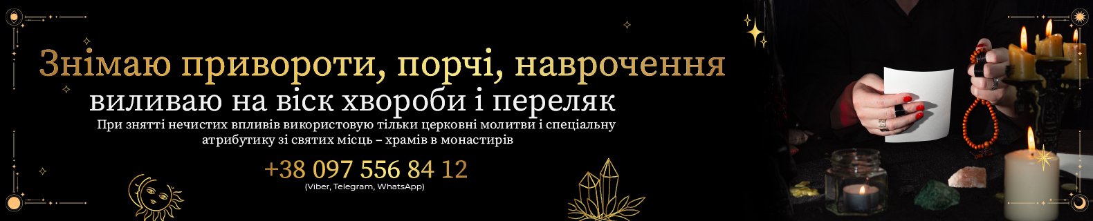 Для цього я використовую сильні обряди як чорної магії, так і білої магії. Я працюю з монастирями, це мої молитви. Використовую православні свічки, святу воду та заговори моїх предків.
